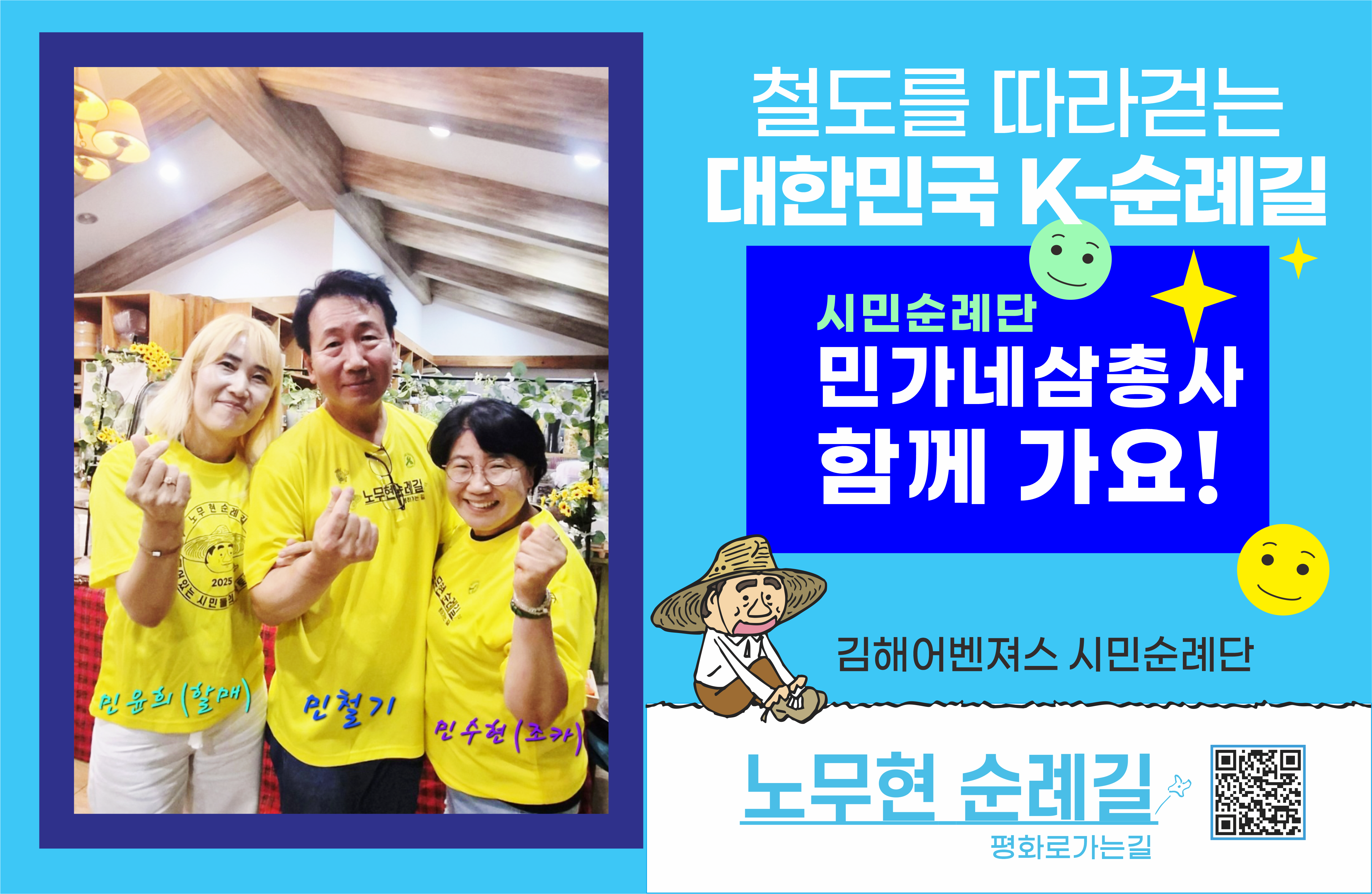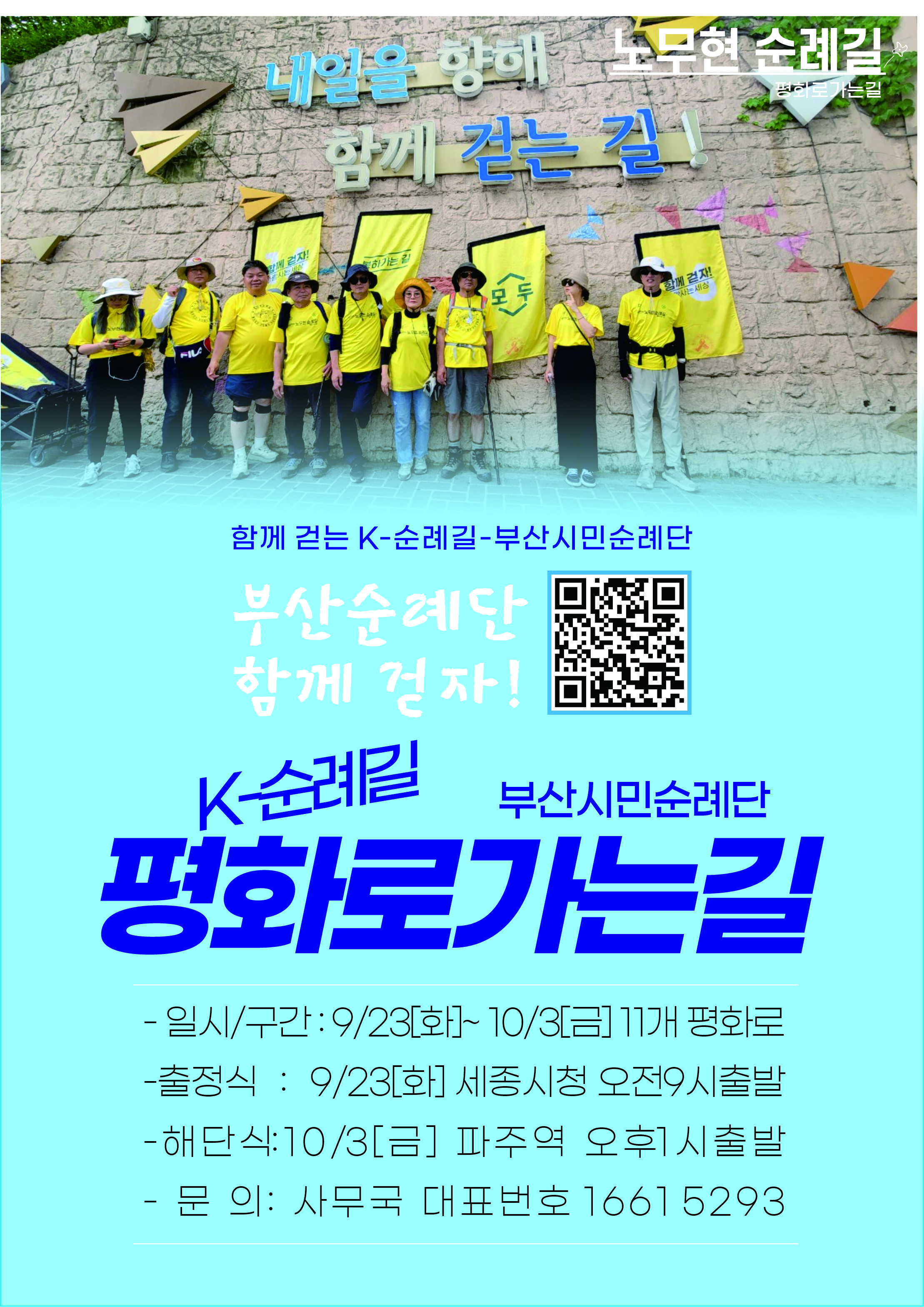1. 시민 여러분의 평화를 빕니다.2. 10·4 남북공동선언 제18주년을 맞아 오는 9월 23일부터 10월 3일까지 총 11일 동안, 세종특별자치시의세종시청에서 파주시의 임진각평화누리공원까지 ‘2025 평화로 가는 길’ 이라는 릴레이 걷기 행사가 진행될 예정입니다.3. 2025 평화로 가는 길은 깨어있는 시민들의 국토대장정-노무현순례길이 10·4 남북공동성명 제18주년을 맞아,6·25 전쟁 이후 휴전상태에 머물러 있는 남과 북의 불안한 상태를 종전협정을 통해 매듭짓고 평화협정을 통해평화의 길과 번영의 길로 나아가기를 바라는 마음에서 개최하는 행사입니다.4. 2025 하반기 노무현순례길-평화로가는길 출정에 맞춰 순례단 참여요청을 드립니다. -